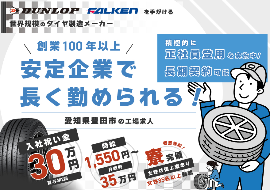 \正社員応募もOK/ 日本最大級の生産規模!住友ゴム工業の中でも主力工場として、乗用車およびトラック・バス用タイヤの製造を行っています!「ダンロップ」「ファルケン」など、多くの方に親しまれているブランドのタイヤを製造するグローバル企業です。手当充実!長期連休+入社時に有休14日付与!